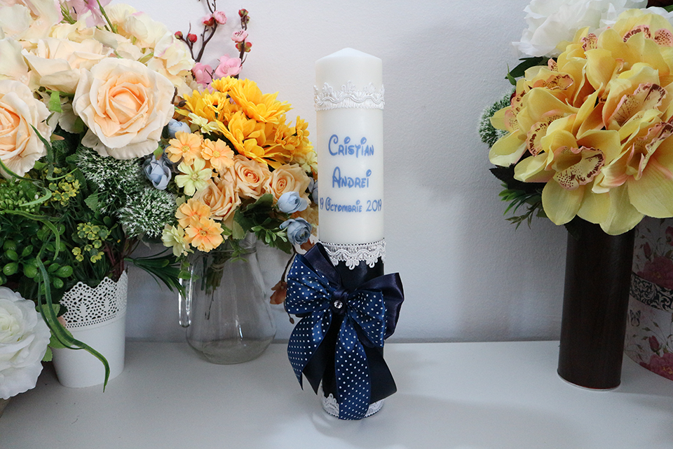 Lumanare de botez cu flori artificiale si plus - Model 9